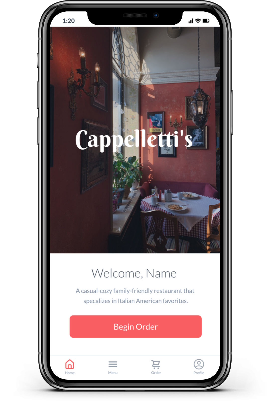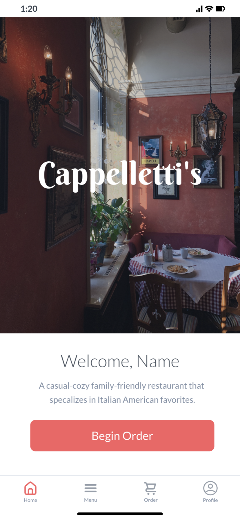This project is one I created for my school. The overall objective was to create a restaurant and establish features for the app that are would best benefit the users experience. I came up with the restaurant Capelletti’s, an Italian restaurant with a small select menu that could accommodate to most people’s diet. I wanted to ensure the user had ample customization of their order by allowing the user to best customize each item they desired. For this mock up, I kept the color scheme relatively simple, utilizing various grays and one red to stand out for the app.