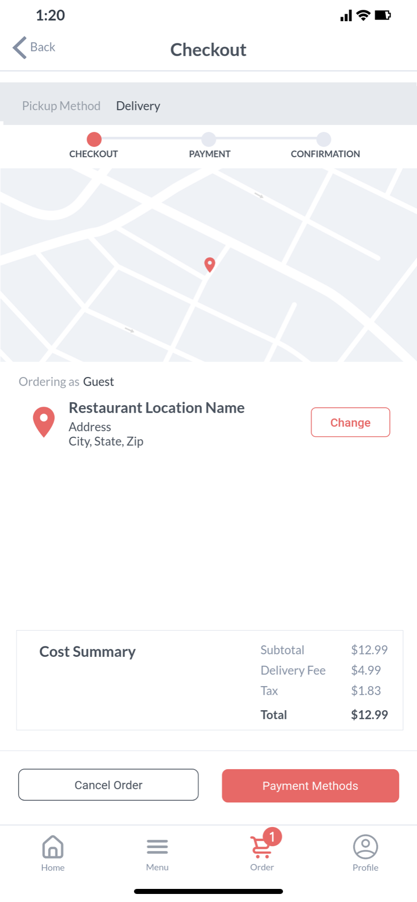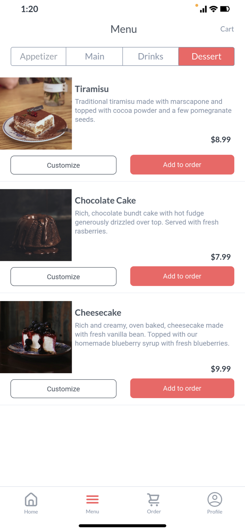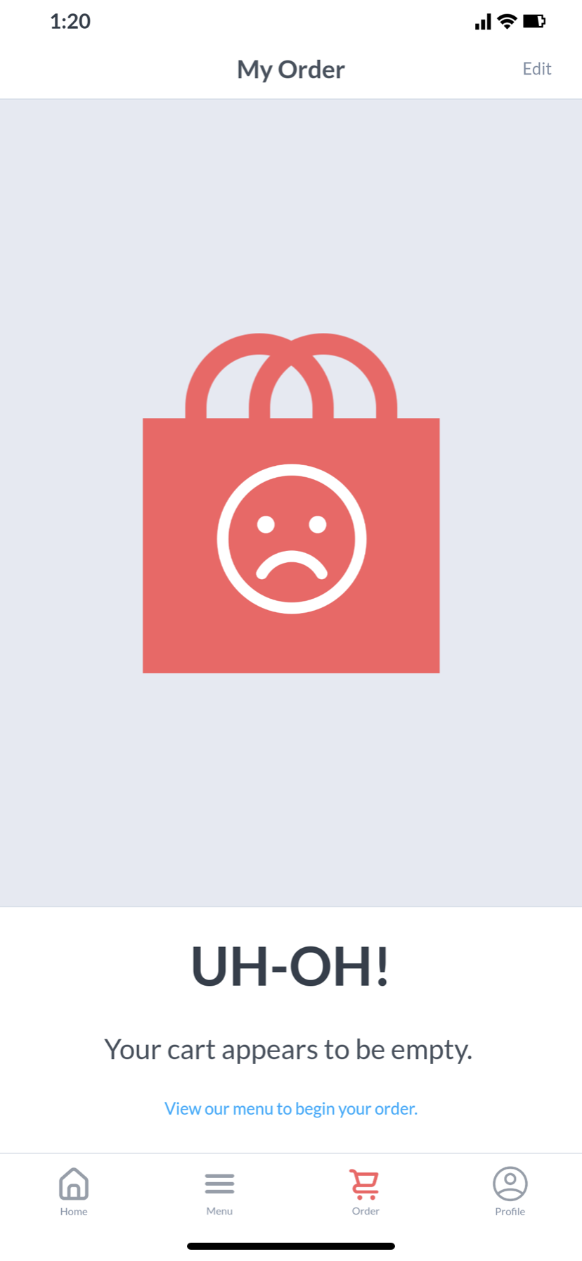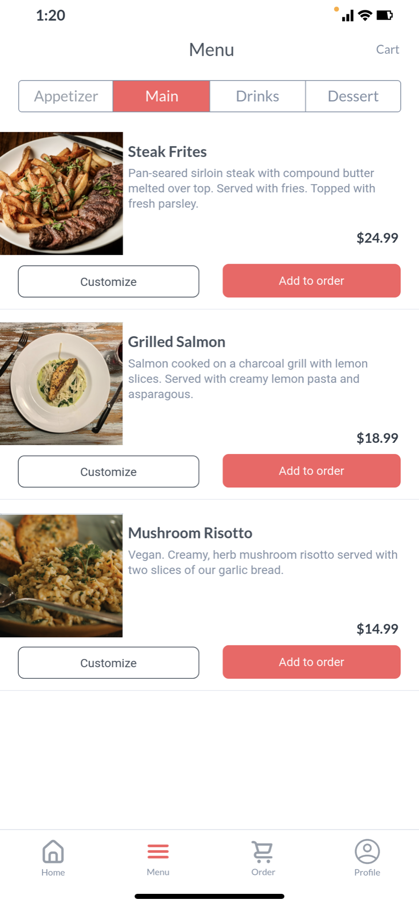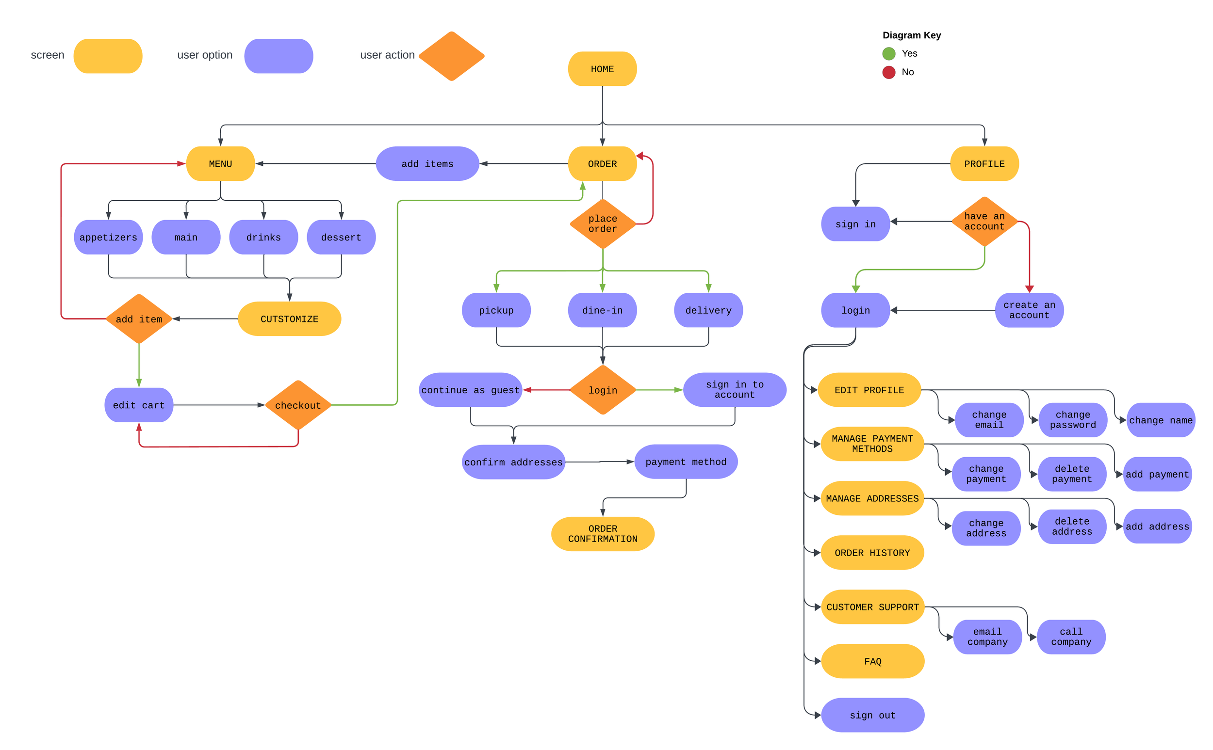 This simplified user flow diagram is a crucial foundation for creating a smooth and stress-free user experience. This diagram allows us to view the users’ movement throughout the application and ensure each path is efficient and clear. For this application, we want a simple and to-the-point flow so the user can quickly and effectively make orders and view the restaurants items.
